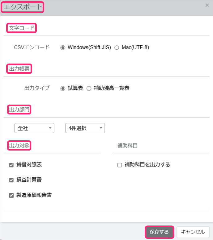2. [エクスポート]のダイアログが表示されます。[文字コード][出力帳票][出力部門]のタイプを選択し、必要に応じて[出力対象]にチェックを入れ、画面右下の[保存する]をクリックします。