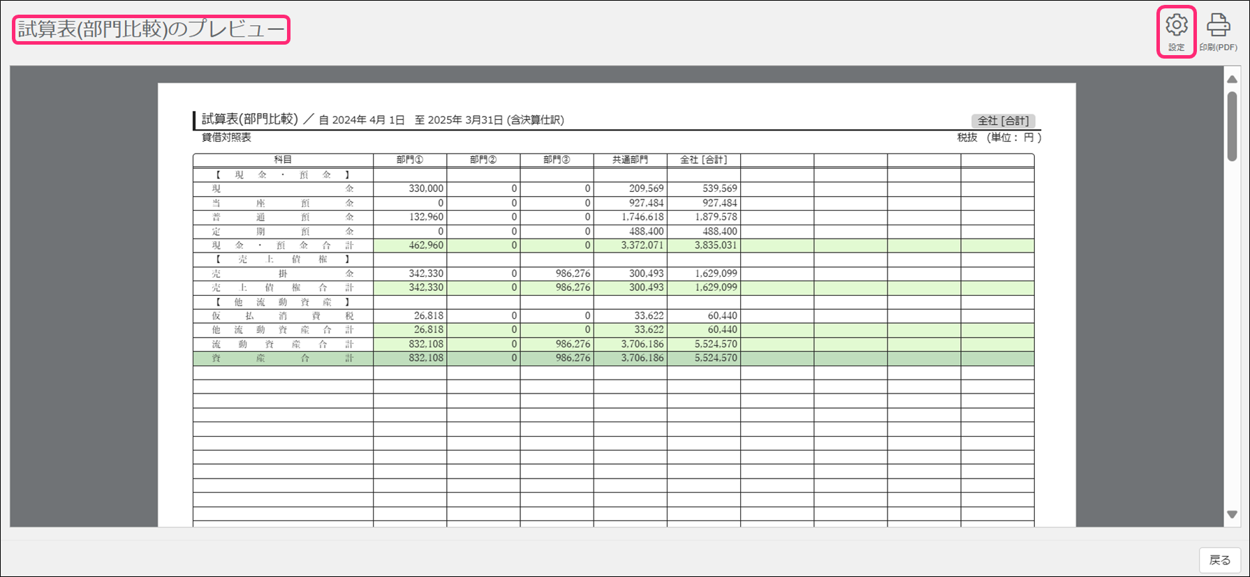 2. [試算表(部門比較)のプレビュー]画面右上の[設定]をクリックします。