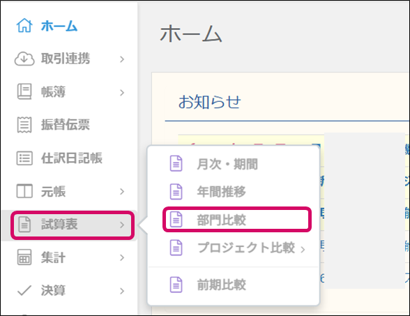 ※試算表(部門比較)はビジネスプラン・エンタープライズプランのみ利用可能となります。