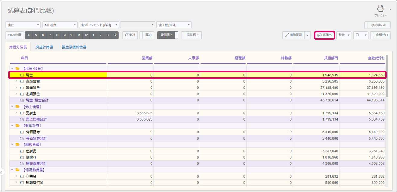 ※[共通部門]では、どの部門にも属していない仕訳の金額が表示されます。