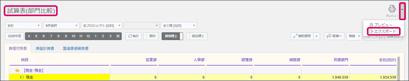 1. [試算表(部門比較)]画面で、エクスポートしたい部門、期間等を選択し、[プレビュー]横の[▼]→[エクスポート]をクリックします。※部門を設定していない場合は選択できません。