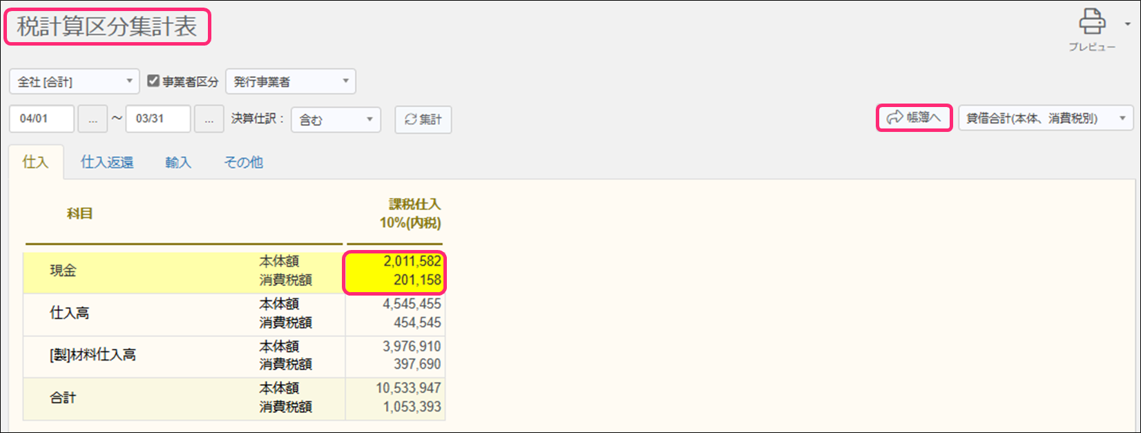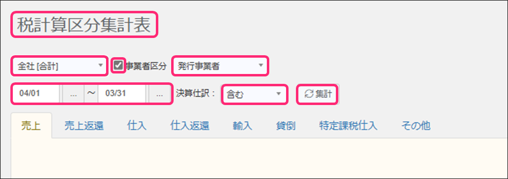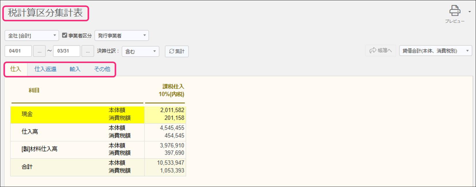 税計算区分集計表は、当期会計期間の仕訳を対象に、科目・発行事業者区分ごとの消費税額を
