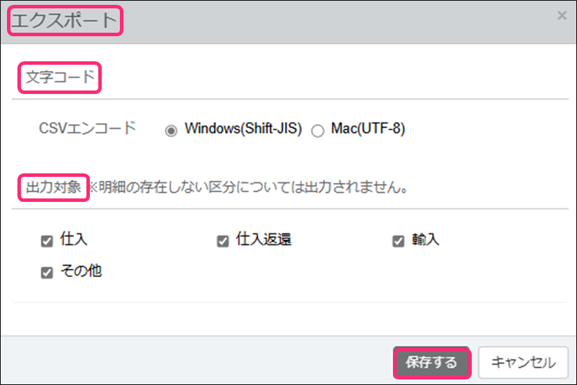 2. [エクスポート]のダイアログが表示されるので、[文字コード]、[出力対象]を選択して、画面右下の[保存する]をクリックします。