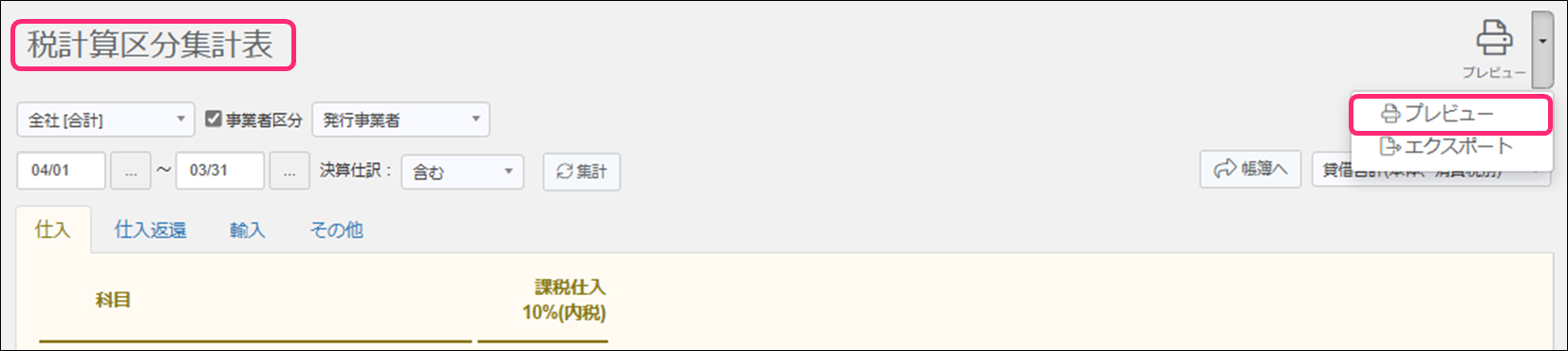 1. [税計算区分集計表]画面右上の「プレビュー」横の「▼」→[プレビュー]をクリックします。
