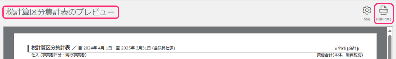4.[税計算区分集計表のプレビュー]画面右上の [印刷(PDF)]をクリックします。