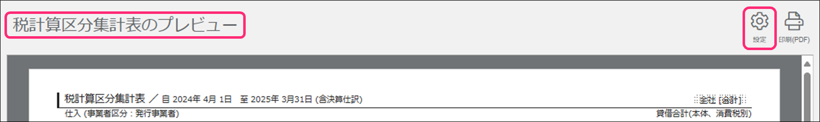 2. [税計算区分集計表のプレビュー]画面右上の「設定」をクリックします。