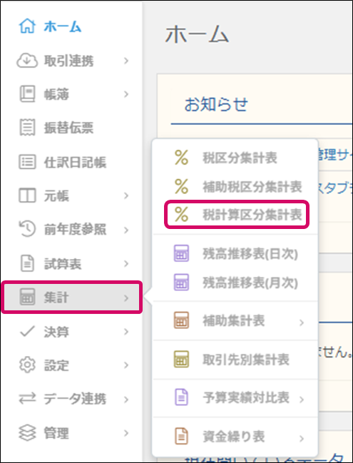 1. メニュー[集計]→[税計算区分集計表]をクリックします。