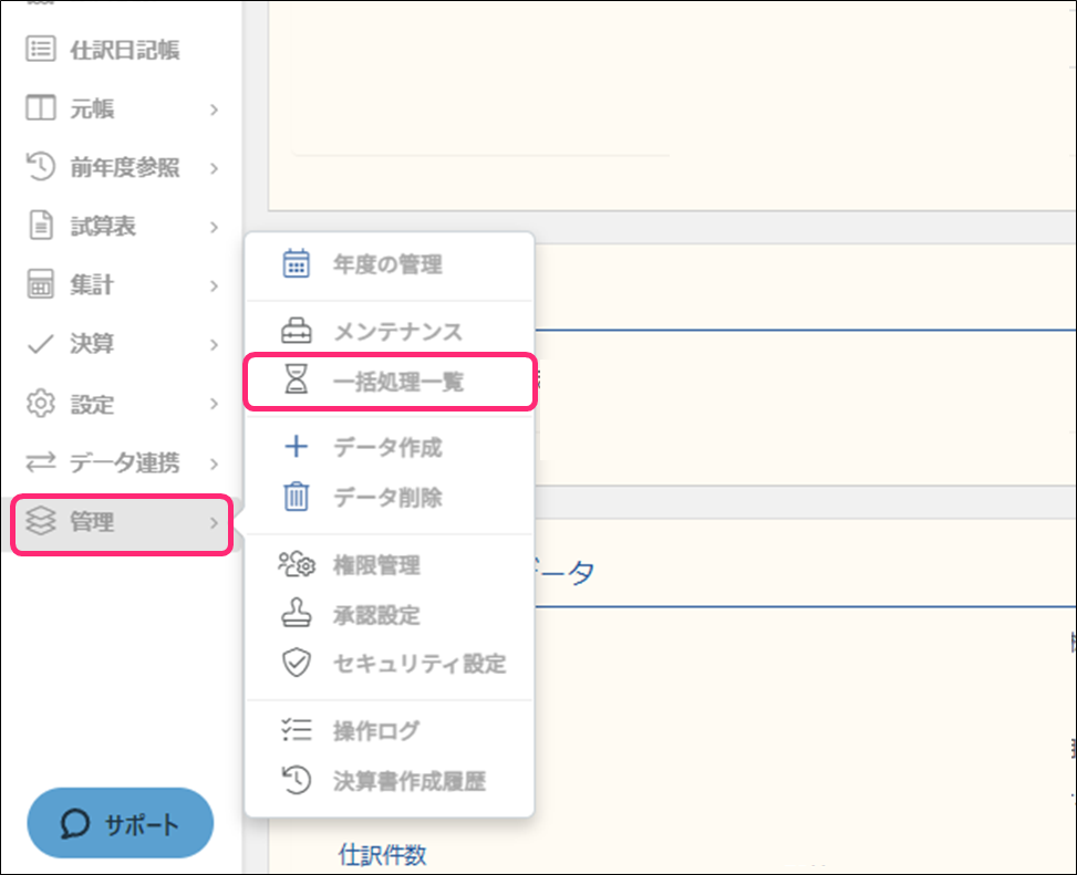 4. メニュー[管理]→[一括処理一覧]をクリックします。