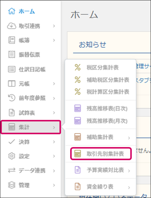 1. メニュー[集計]→[取引先別集計表]をクリックします。