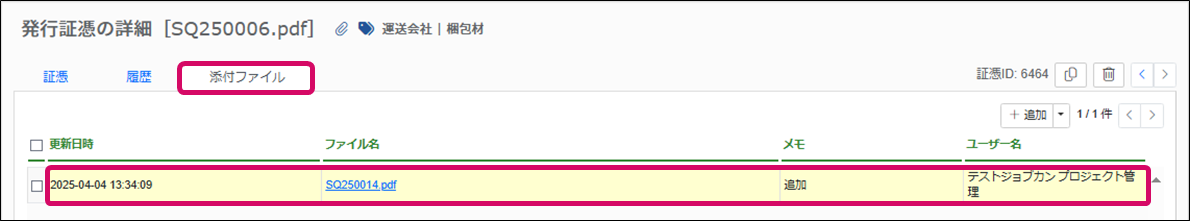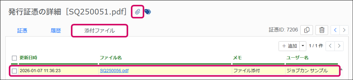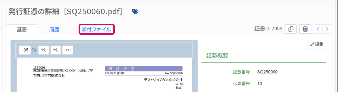 3. 詳細の詳細画面(証憑のプレビュー/編集画面)が表示されるので、[添付ファイル]タブをクリックします。
