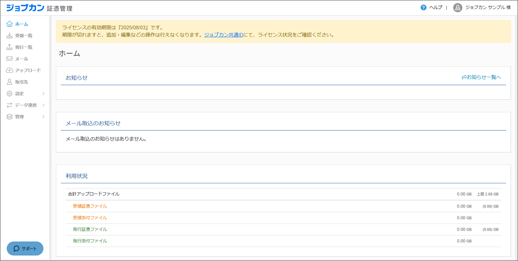 3. ジョブカン証憑管理の[ホーム]画面が表示されます。