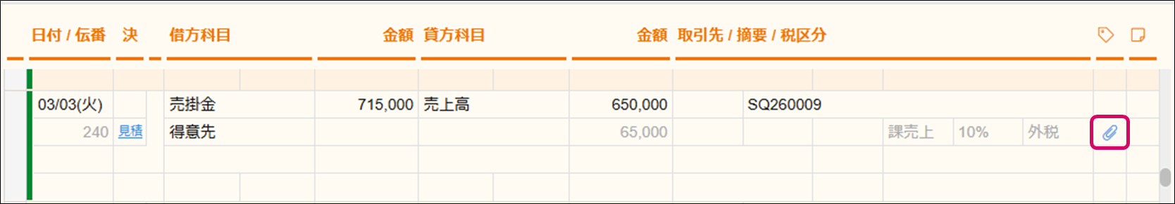 仕訳日記帳と同様に仕訳行の クリップマークをクリックします。