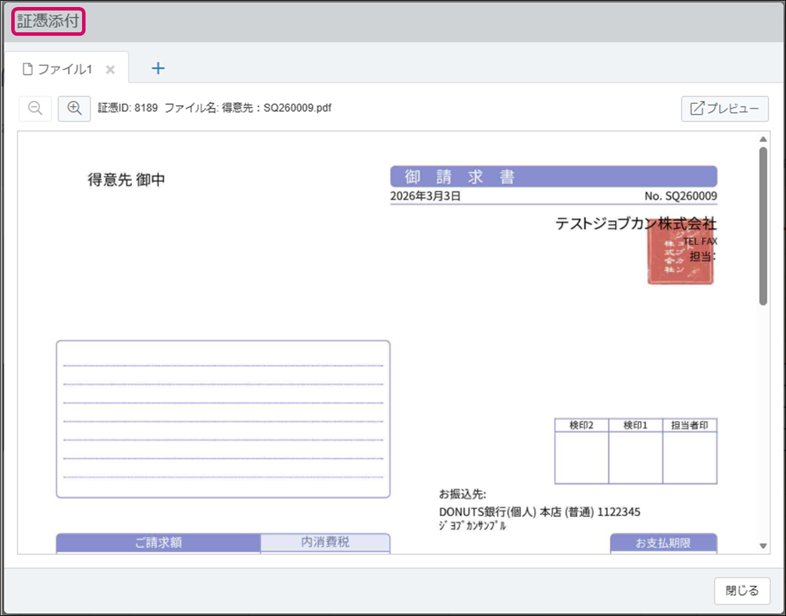 5. [証憑添付]ダイアログが表示されます。添付した証憑の内容を確認します。