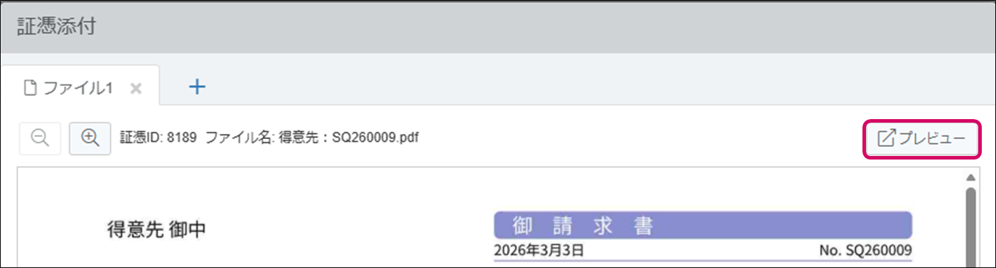 4. 添付したい証憑のファイル名をクリックすると、左側に該当の証憑が表示されます。ファイル内容に問題がなければ、ファイル名の並びにある「+」ボタンで登録します。
