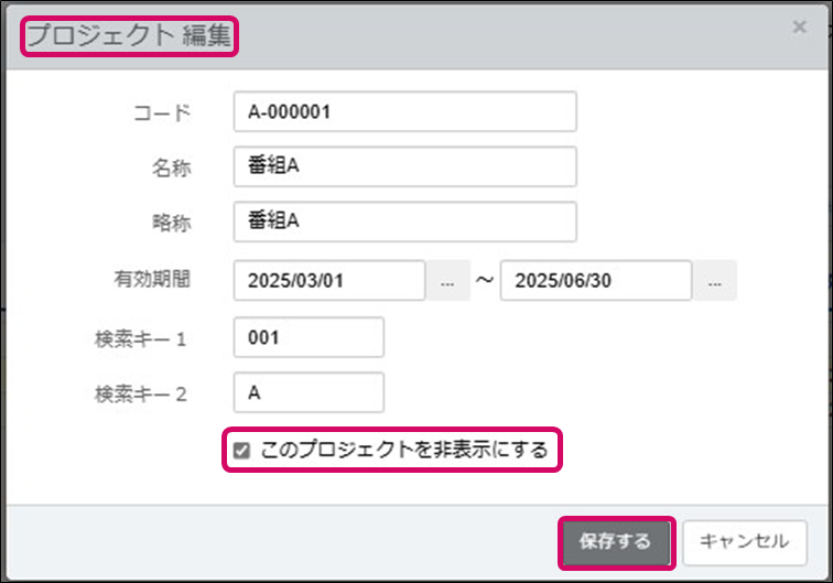 ③. 非表示にする場合は「このプロジェクトを非表示にする」または「この補助プロジェクトを非表示にする」にチェックを入れ、[保存する]をクリックします。