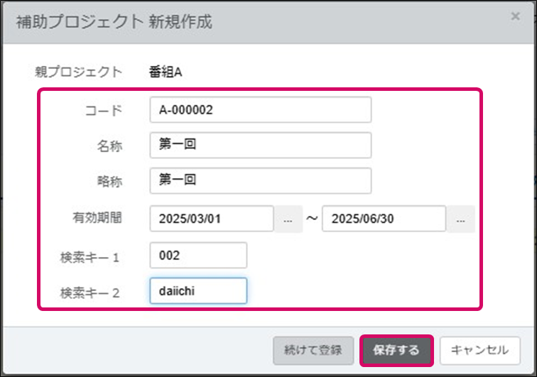 ③-2.[補助プロジェクト新規作成]ダイアログが表示されます。名称、略称、有効期間、検索キー1、検索キー2をそれぞれ入力し、[保存する]をクリックします。