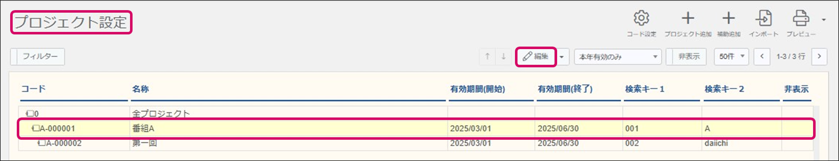 ①. [プロジェクト設定]画面で 編集したいプロジェクトまたは補助プロジェクトの行を選択し[編集]をクリックまたは行をダブルクリックします。