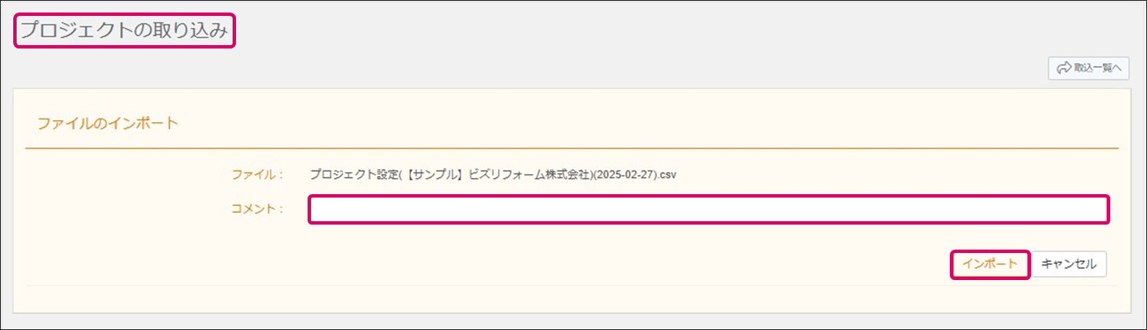 3. [ファイルのインポート]画面が表示されます。必要があれば[コメント]欄にコメントを入力し、[インポート]をクリックします。