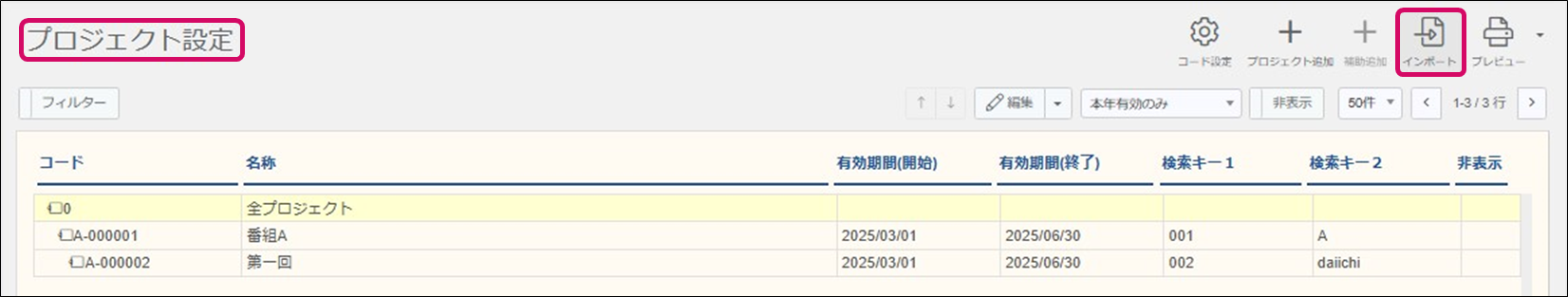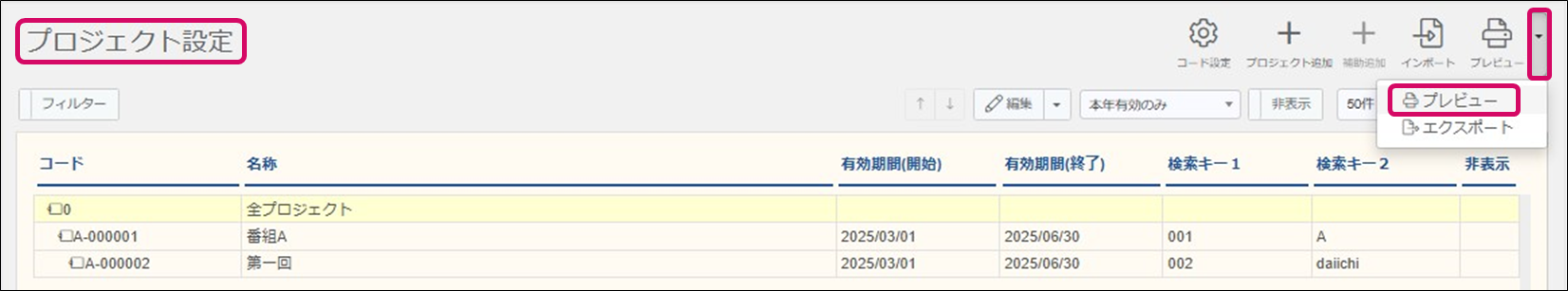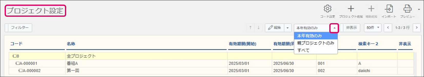 ※必要に応じて表示するプロジェクト「本年有効のみ」、「親プロジェクトのみ」、「すべて」