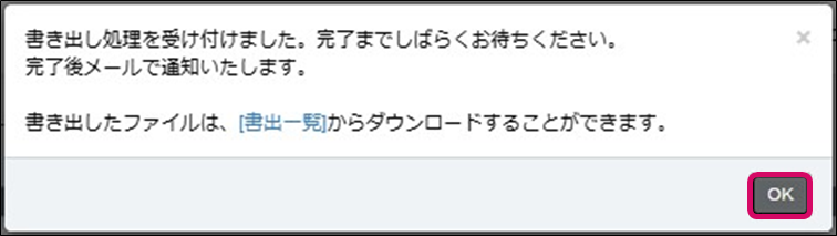 3. 書き出し処理受付のダイアログが表示されます。右下の[OK]をクリックして完了です。