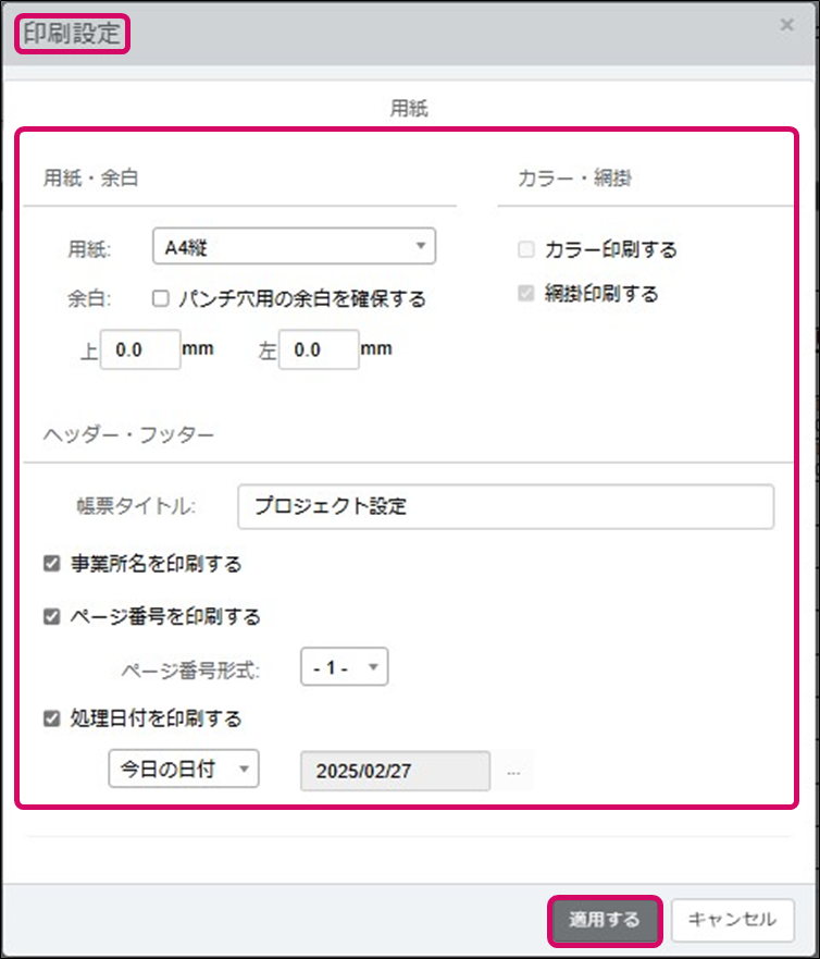3. [印刷設定]が表示されます。必要に応じて[用紙]の設定を行い、右下の[適用する]をクリックします。