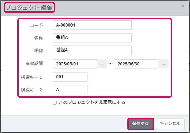 ※有効期間を編集する場合、すでに該当のプロジェクトが仕訳に設定されており、その仕訳が有効期間外となるような変更はできません。