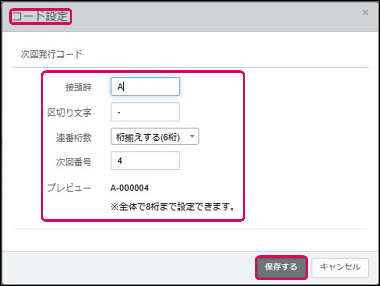 3. [コード設定]ダイアログが表示されます。接頭辞、区切り文字を入力し、連番桁数を選択し、