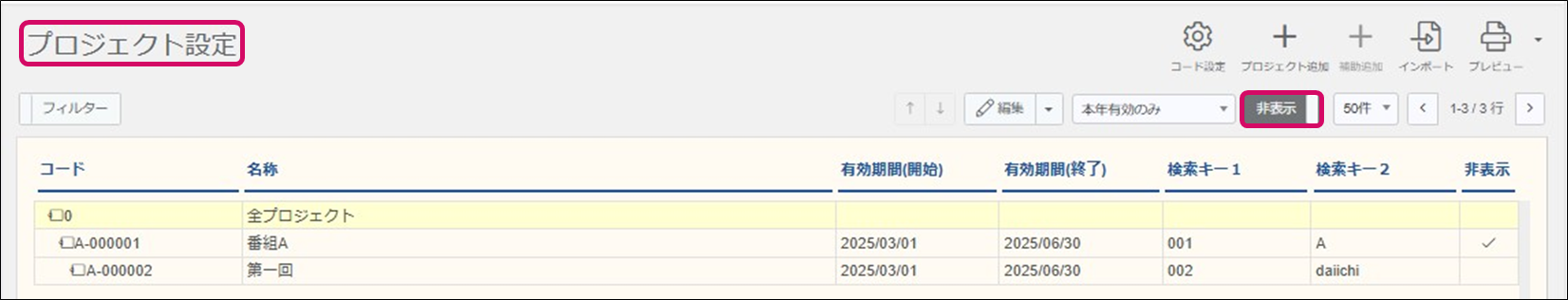 ※プロジェクトを非表示にすることで補助プロジェクトも非表示になります。