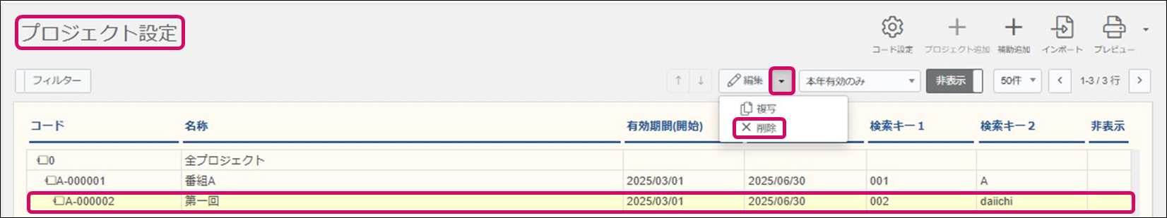 ①. [プロジェクト設定]画面で削除したいプロジェクトをクリックしたら、画面右上[編集]横の[▼]をクリックし、[削除]をクリックします。