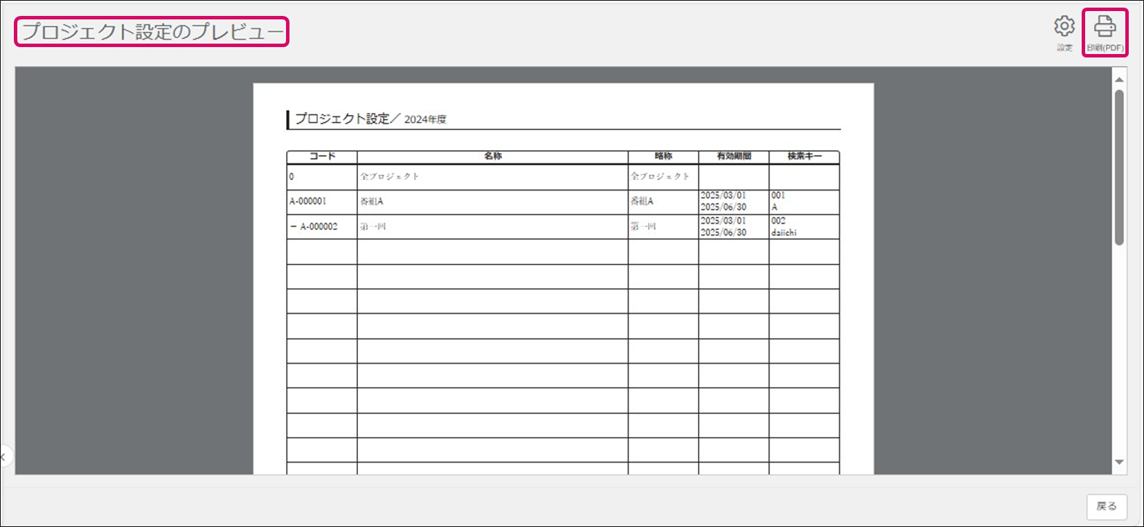 4. [プロジェクト設定のプレビュー]画面右上の[印刷(PDF)]をクリックします。