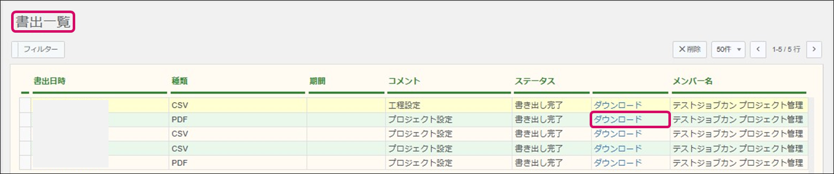 5. [データ連携]→[書出一覧]をクリックし、該当CSVデータの[ダウンロード]をクリックするとダウンロードが可能です。