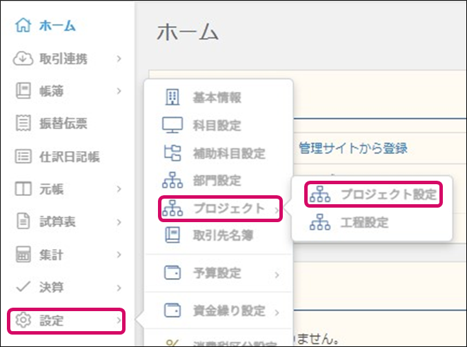 1. メニュー[設定]→[プロジェクト]→[プロジェクト設定]をクリックします。