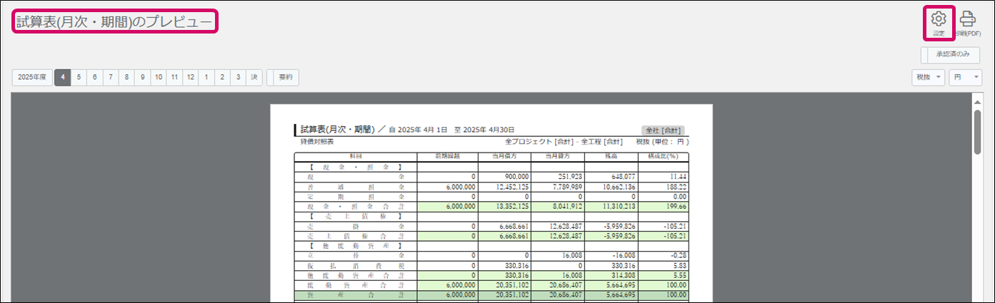 3. [試算表(月次・期間)のプレビュー]画面右上の[設定]をクリックします。