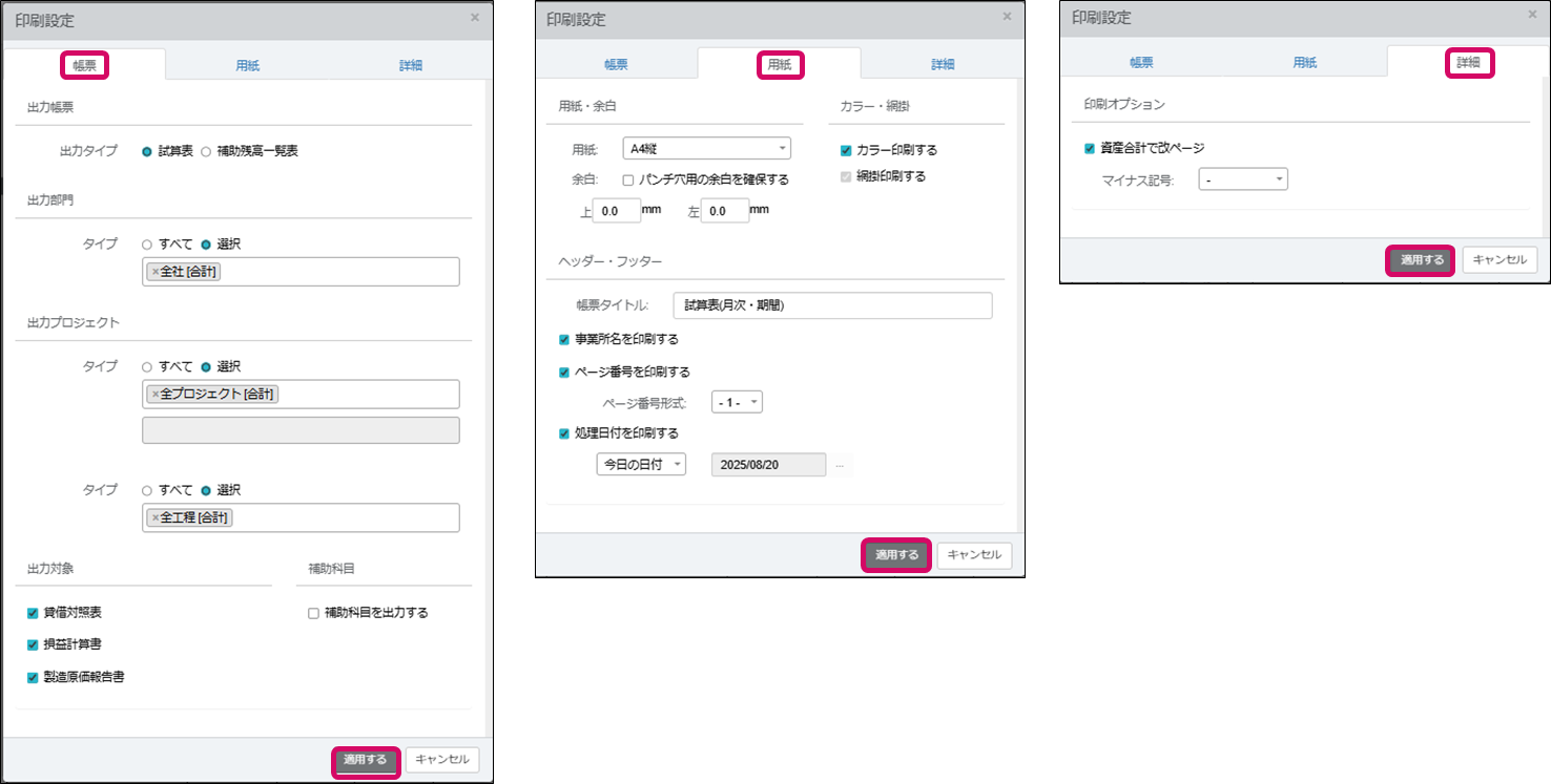 4. [印刷設定]が表示されます。必要に応じて[帳票]、[用紙]、[詳細]の設定を行い、右下の[適用する]をクリックします。
