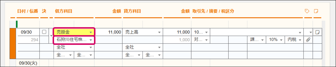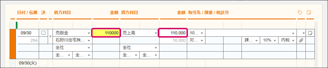 5. 必要に応じて、 [借方]か[貸方]のいずれかに「金額」を修正します。一方を入力すると、もう一方にも自動的に同じ金額が反映されます。