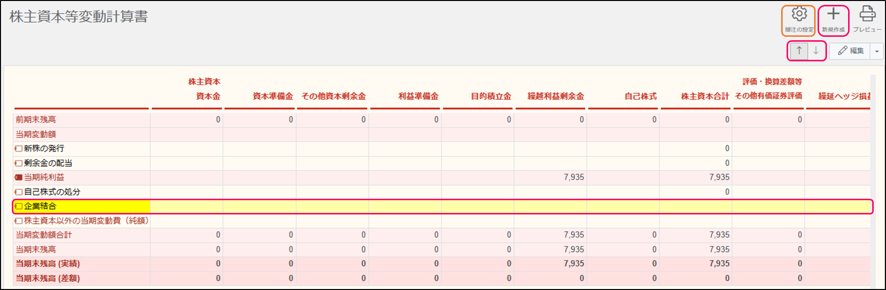 2. [株主資本等変動計算書]画面が表示されます。変動項目を新規作成したり、変動金額を入力したりします。