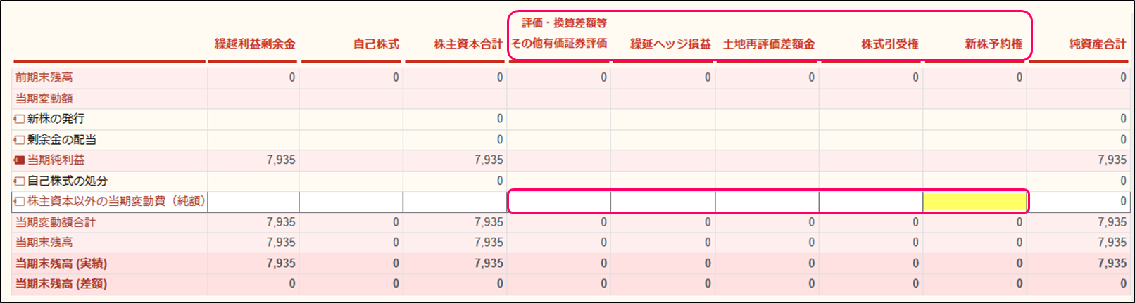 「株主資本以外の当期変動費(純額)」の行は、