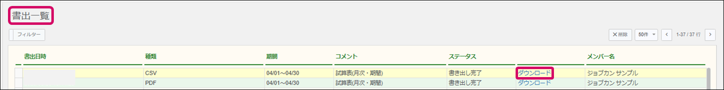 5. [データ連携]→[書出一覧]をクリックし、該当データ行にある [ダウンロード] をクリックしてください。