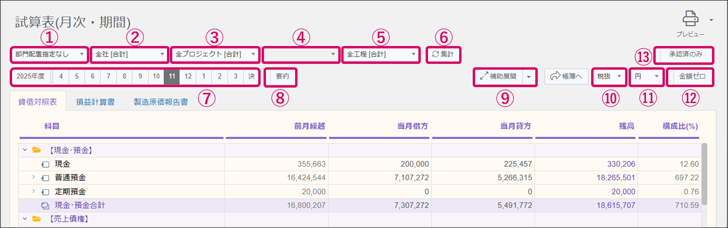 試算表(月次・期間)では、貸借別に勘定科目や補助科目ごとの合計額と残高を、指定した月度や期間で表示します。