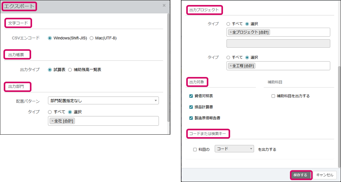 必要に応じて[出力対象]にチェックを入れます。[コードまたは検索キー]を出力する場合は、チェックを入れてから対象を選択し、画面右下の[保存する]をクリックします。