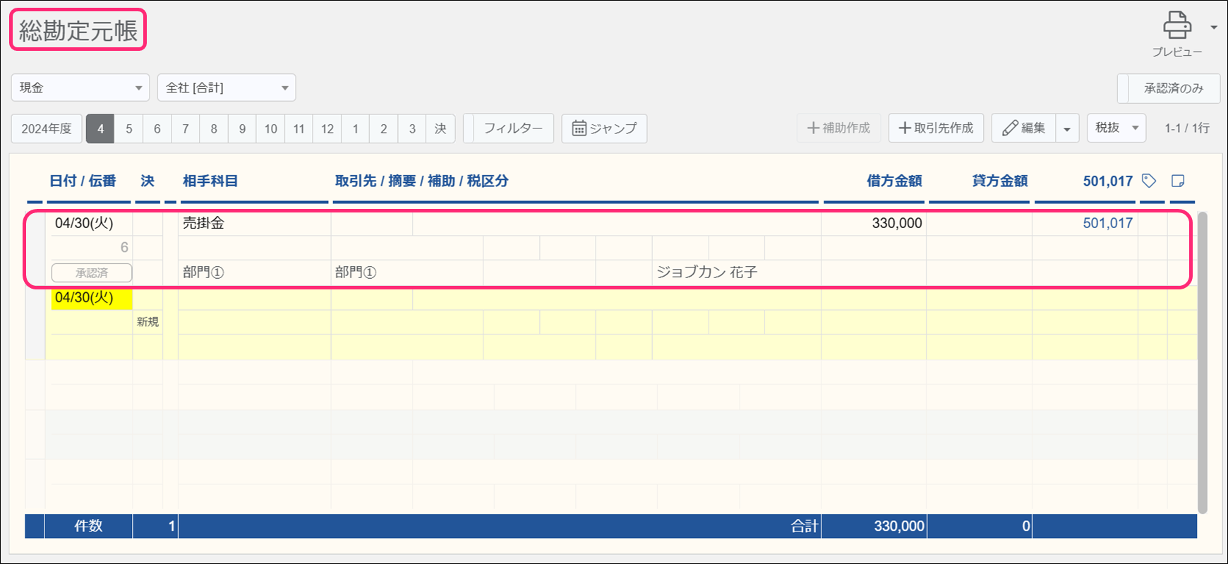 4. [総勘定元帳] 画面が表示されますので、そちらから確認・修正してください。補助科目を選択した場合は、[補助元帳]が表示されます。詳しくは、「総勘定元帳で取引を修正する」「補助元帳で取引を修正する」をご覧ください。