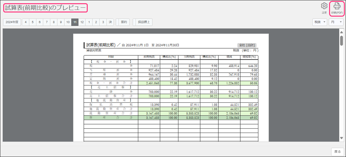 4. [試算表(前期比較)のプレビュー]画面右上の[印刷(PDF)]をクリックします。