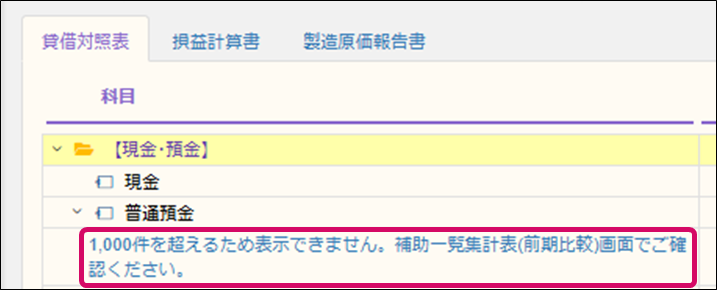 ※補助科目が1,000行を超える場合は「1,000件を超えるため表示できません。補助一覧集計表(前期比較)画面でご確認ください。」のメッセージが表示されるので、文字の箇所をクリックすると補助一覧集計表(前期比較)に遷移して確認ができます。