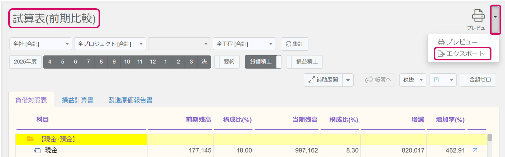1. [試算表(月次・期間)]画面で、印刷したい部門、期間等を選択し、[プレビュー]横の[▼]→[エクスポート]をクリックします。