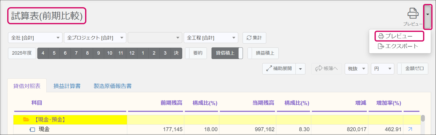 1. [試算表(前期比較)]画面右上の[プレビュー]または横の[▼]→[プレビュー]をクリックします。