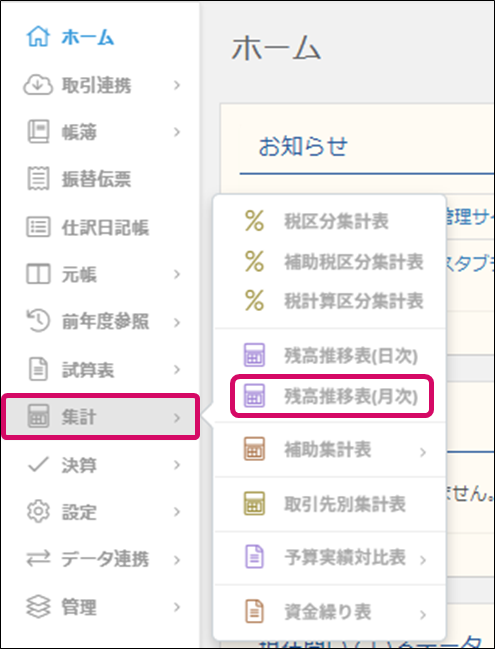 1. メニュー[集計]→[残高推移表(月次)]をクリックします。