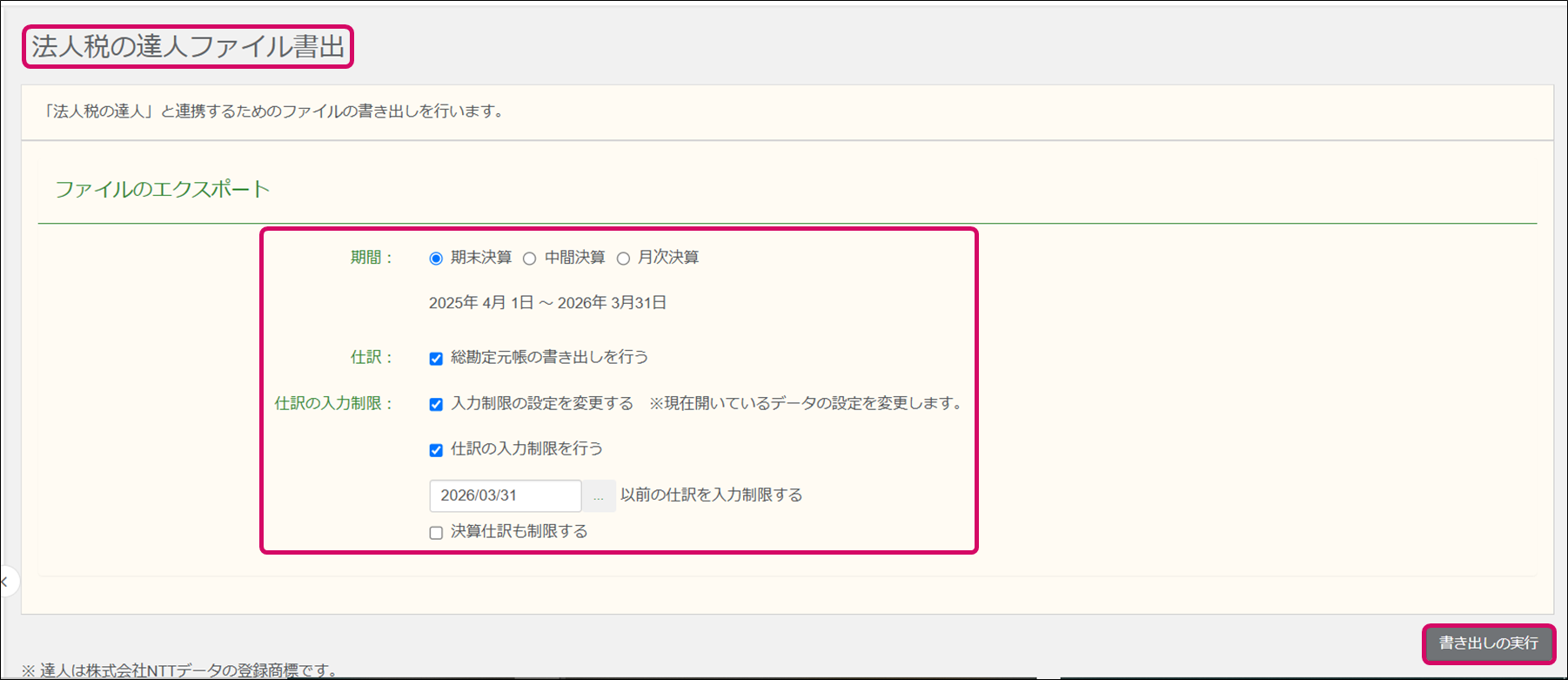 2. [法人税の達人ファイル書出]画面が表示されます。期間、仕訳、仕訳の入力制限を設定し右下[書き出しの実行]をクリックします。