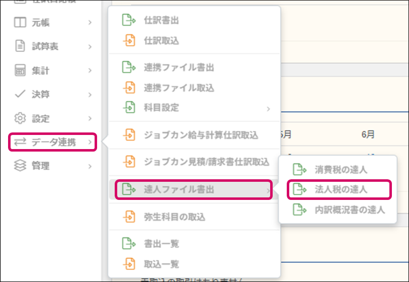 ジョブカン会計では必要に応じて、「法人税の達人」と連携するためのファイルを書き出すことが可能です。連携ファイルの書き出し方法は以下です。