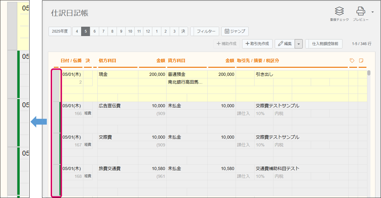 2. 左端をクリックしたままドラッグすることで、連続する複数の仕訳を一括で選択できます。