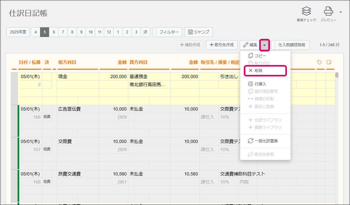 ※この手順により、登録済みの仕訳を複数選択して一括で削除できます。